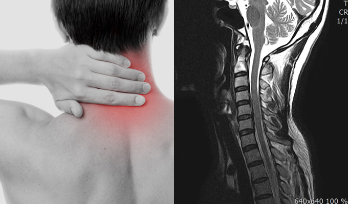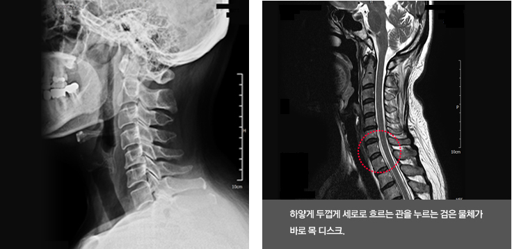 목 뼈와 뼈 사이의 디스크가 제자리에서 이탈되어 신경을 압박하던가 뼈 조직이 비정상적으로 자라 목을 지나는 척추 신경이 눌려 통증을 인지하는 질환이고요.